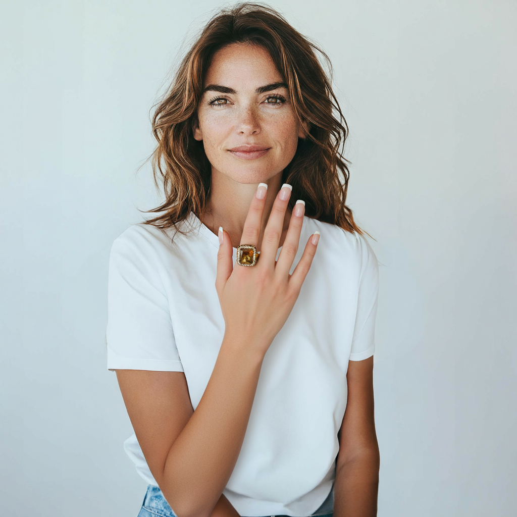 Anello donna con maxi pietra quadrata ambra e finitura oro