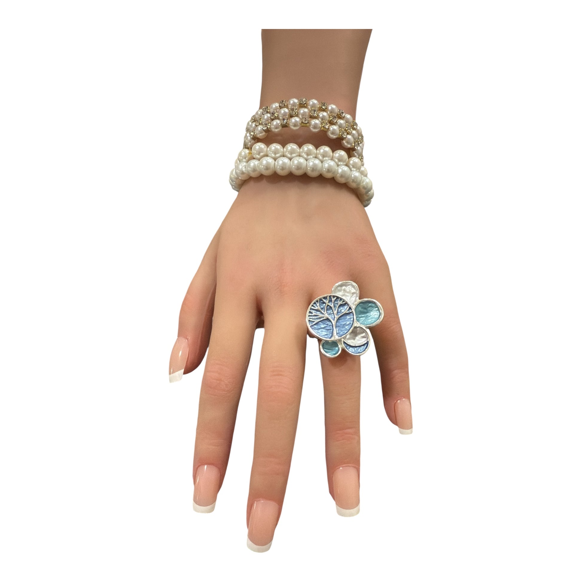 Esprimi la tua personalità con questo elegante anello elastico da donna, decorato con l’Albero della Vita. Il design a cinque petali smaltati con finitura perlata racchiude un simbolo di forza, crescita e armonia. Ogni petalo è unico, disponibile in diverse varianti colore: blu, nero, rosa, verde, oro e multicolor.