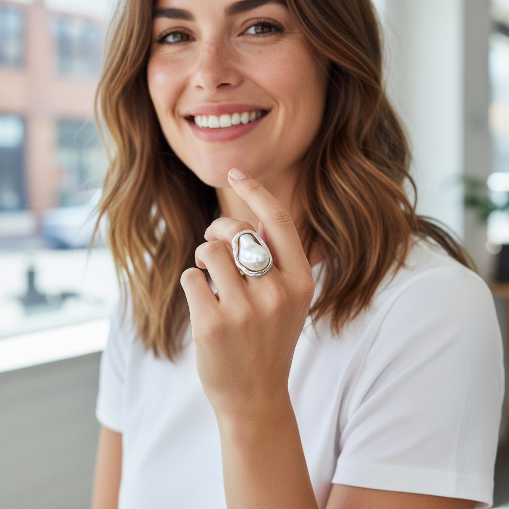 Distinguiti con un gioiello dallo stile audace e contemporaneo. Questo anello statement presenta una maxi perla barocca effetto scultura, incastonata in una montatura irregolare color argento lucido. La forma organica e il design moderno lo rendono perfetto per chi ama accessori originali e di carattere.