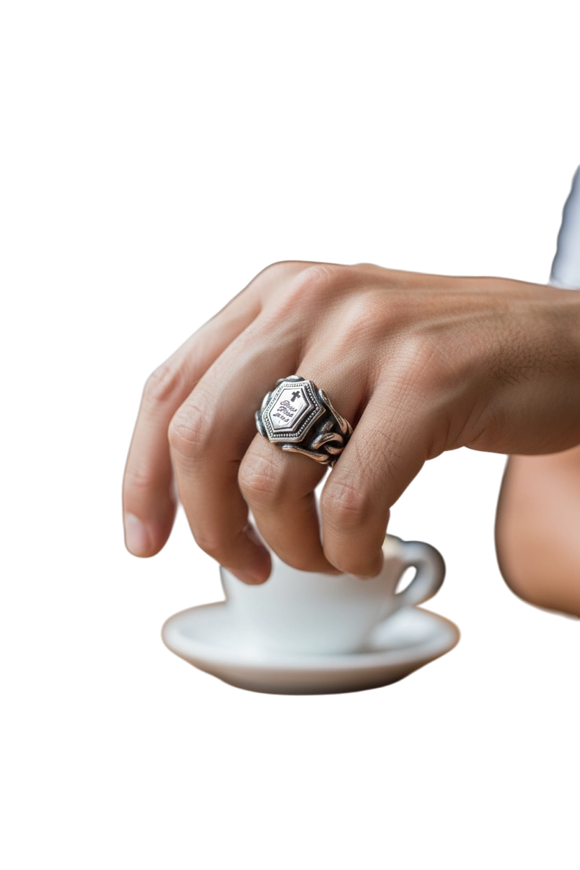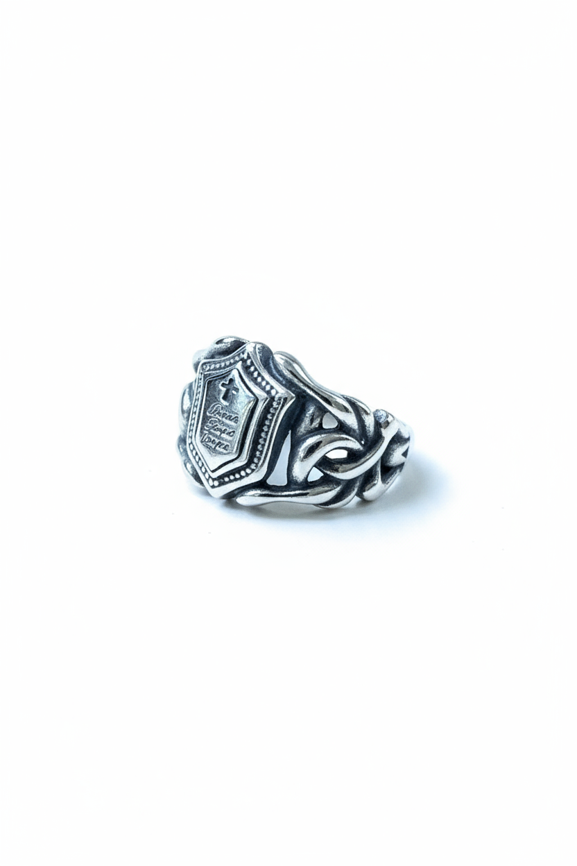 Anello maschile d’ispirazione vintage con scudo inciso e croce al centro e fianchi con motivo a maglie intrecciate. Finitura argento anticato per un look deciso che si abbina a outfit casual, street e biker.
