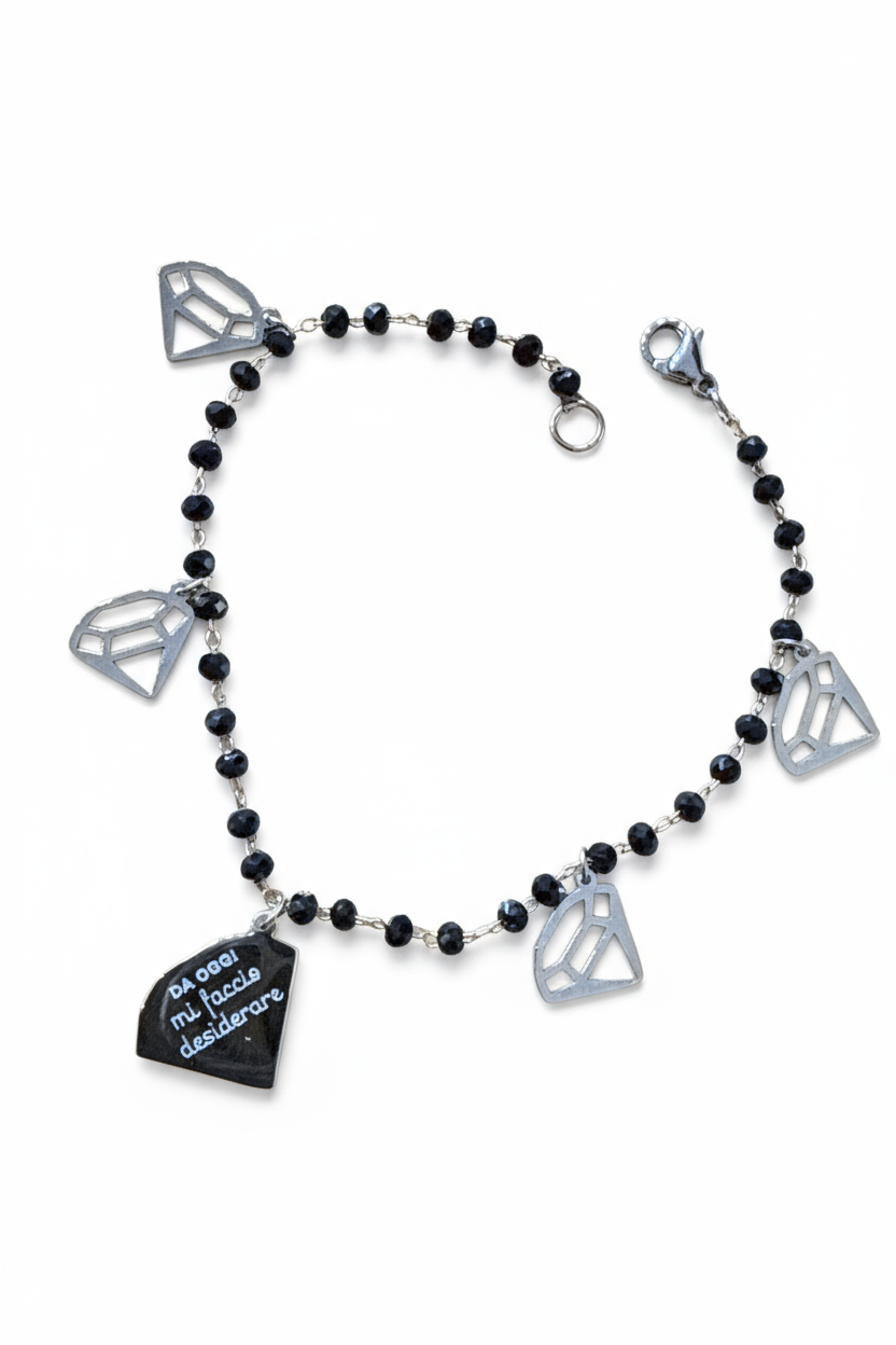 Bracciale trendy con catena di perline sfaccettate e ciondoli grafici. Leggero e versatile: perfetto per l’uso quotidiano e come idea regalo.