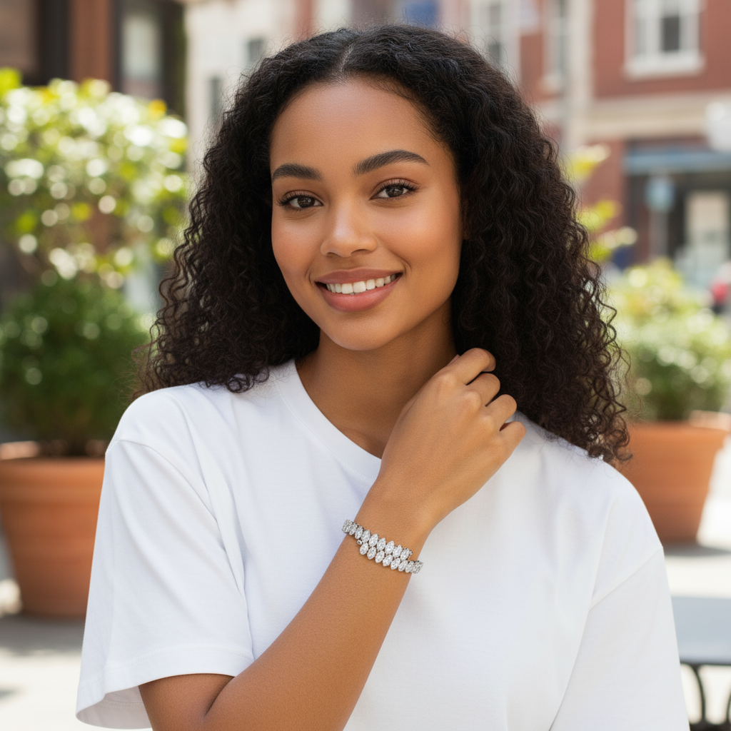 Elegante bracciale tennis da donna in acciaio inox, arricchito da zirconi taglio marquise disposti in doppia fila. Un accessorio luminoso e raffinato, perfetto per cerimonie, eventi e serate speciali.