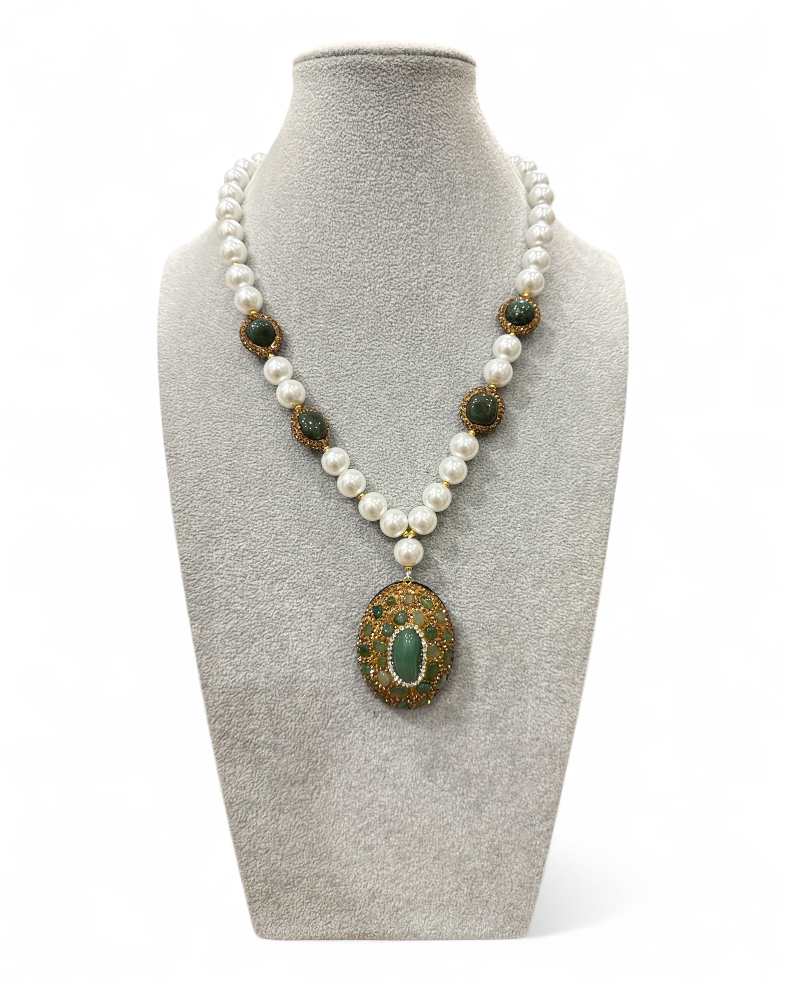 Collana elegante con perle bianche effetto lucido e pendente ovale verde incorniciato da dettagli tono oro. Un gioiello d’impatto, perfetto per cerimonie e outfit raffinati.