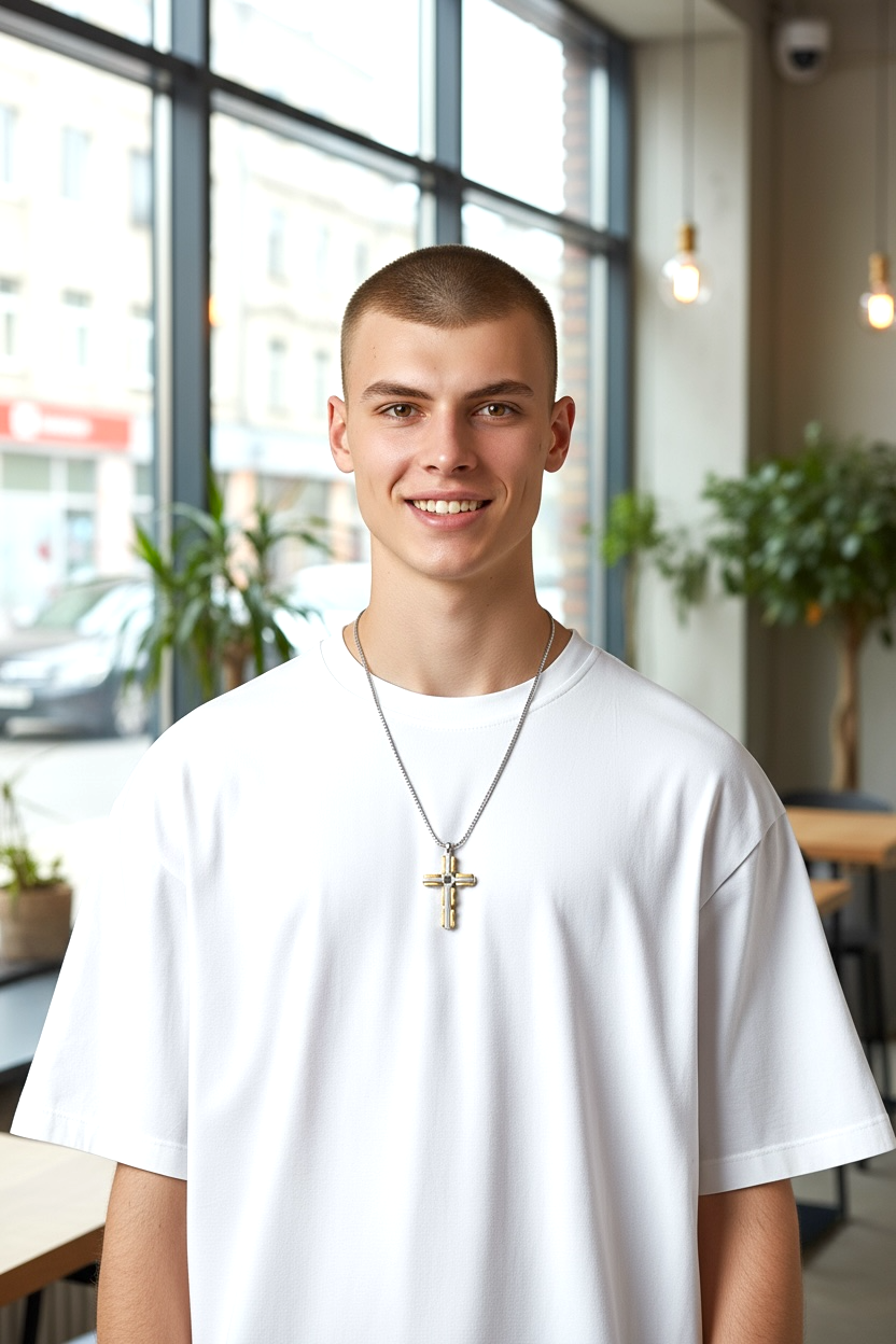 Collana da uomo con pendente a croce realizzato in acciaio inox bicolore, impreziosito da dettagli dorati e inserto nero centrale. Un gioiello moderno e robusto, perfetto per chi cerca un accessorio simbolico e di carattere, da indossare ogni giorno o nelle occasioni speciali.