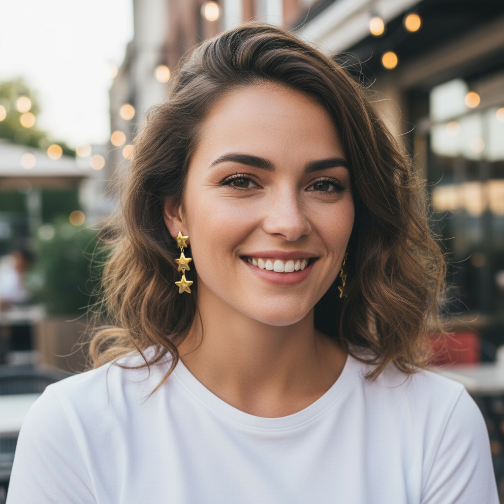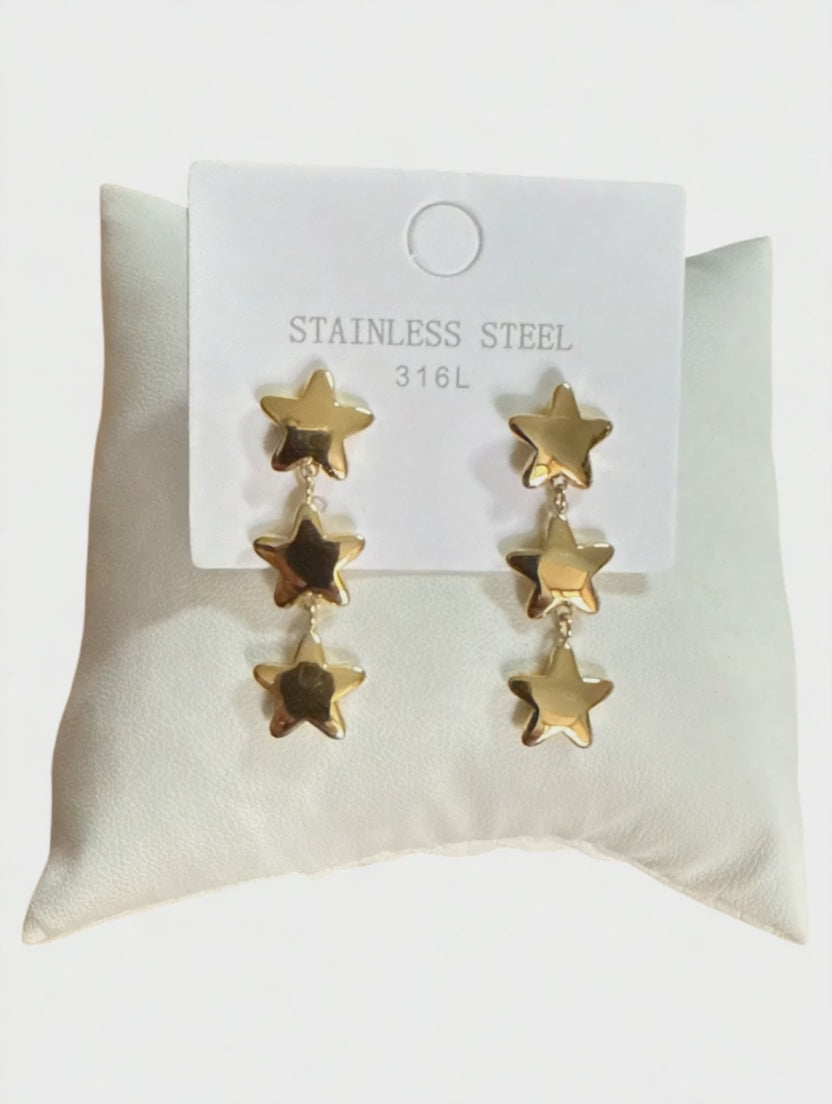 Orecchini a lobo con pendente a tre stelle in acciaio inossidabile 316L color oro lucido. Design leggero e luminoso, perfetto per aggiungere un tocco stellare ai look di tutti i giorni e alle serate.