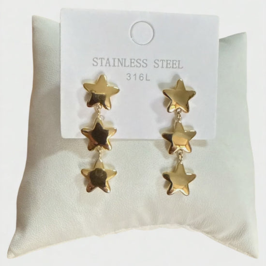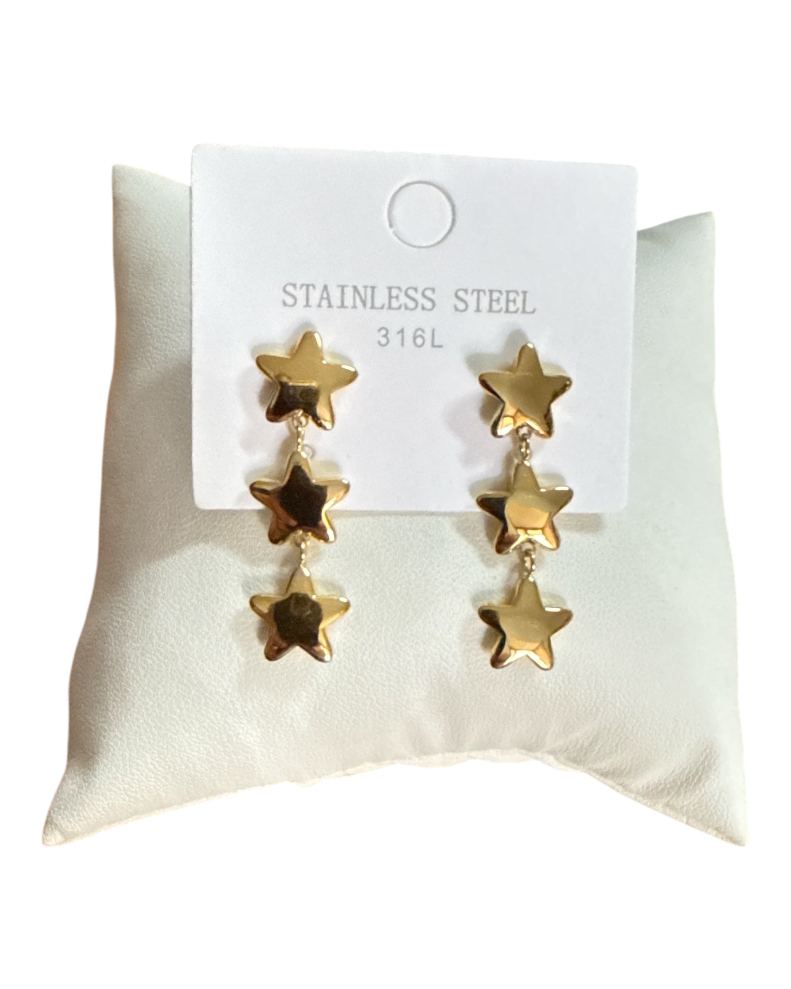 Orecchini pendenti da donna con tre stelle in acciaio inox 316L. Finitura oro lucido, chiusura a perno, stile elegante e minimal per outfit quotidiani e occasioni speciali.