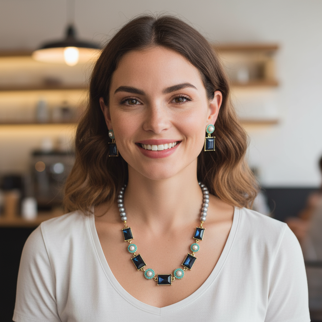 Set collana e orecchini donna – Perle grigie, cristalli blu e dettagli verde acqua
