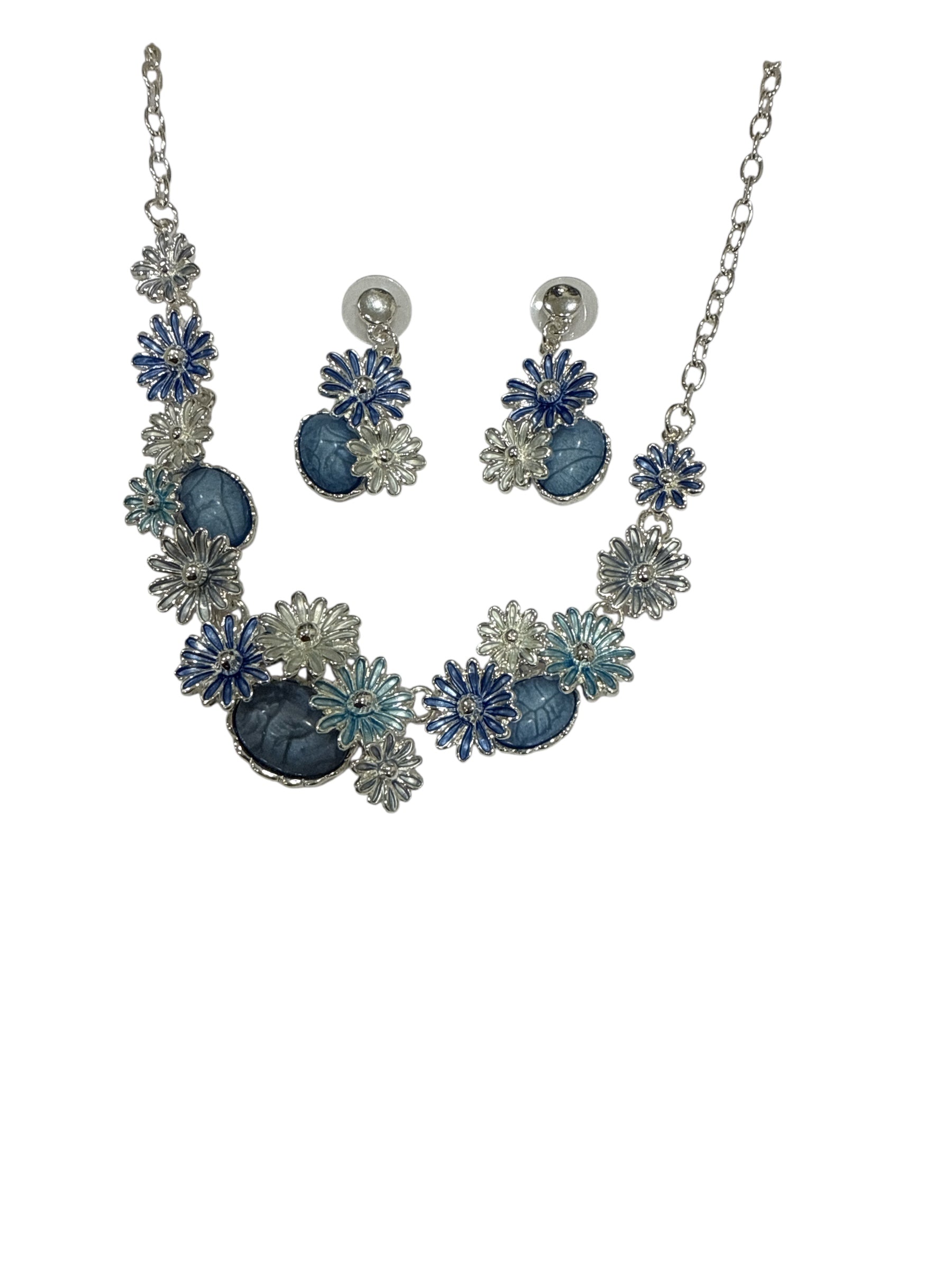 Set Collana + Orecchini Floreali smaltati blu su base metallo