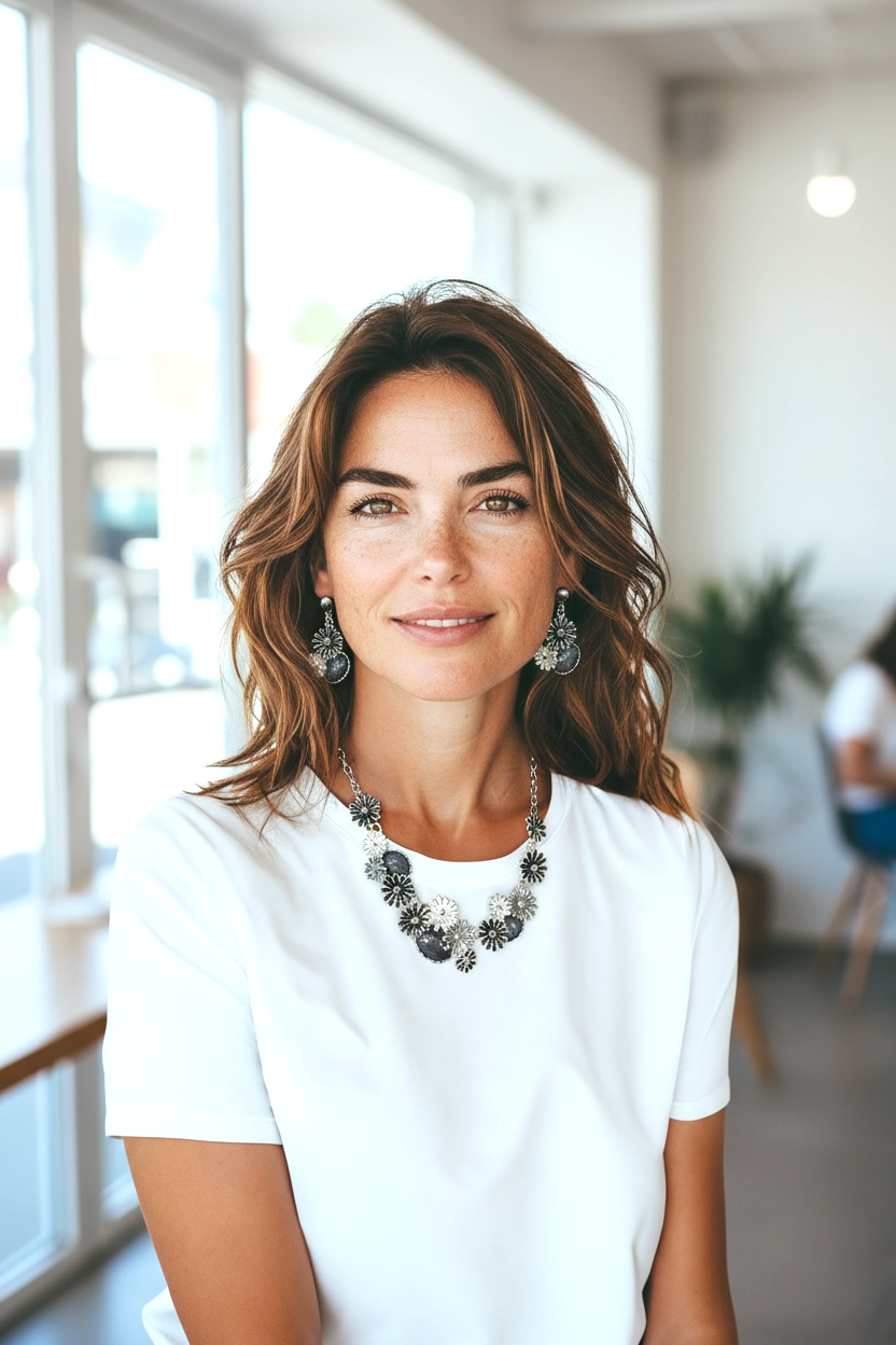 Parure contemporanea con collana e orecchini su base metallo finitura argentata, decorata con elementi floreali smaltati in tonalità blu. Look luminoso e femminile, ideale per outfit casual chic e occasioni speciali.